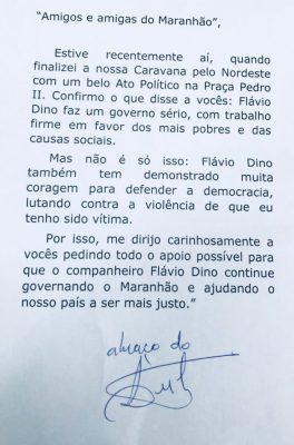 Por isso, me dirijo carinhosamente a vocês pedindo todo o apoio possível para que o companheiro Flávio Dino continue governando o Maranhão e ajudando o nosso país a ser mais justo.
