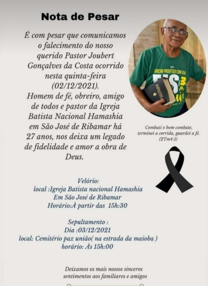 Luto: Pastor Joubert Gonçalves da Costa da igreja Batista Nacional Central (Hamashia) de São José de Ribamar foi promovido ao céu, e descansou no Senhor, ele era presidente da Igreja Batista Nacional, presidente do Conselho de Pastores de Ribamar